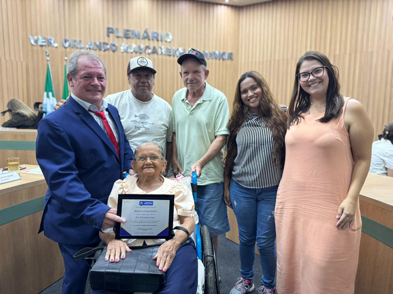Dona Nair junto a familiares e ao vereador Gilsinho, durante a entrega da moção de congratulações (Foto: Graziella Dias/Assessoria)