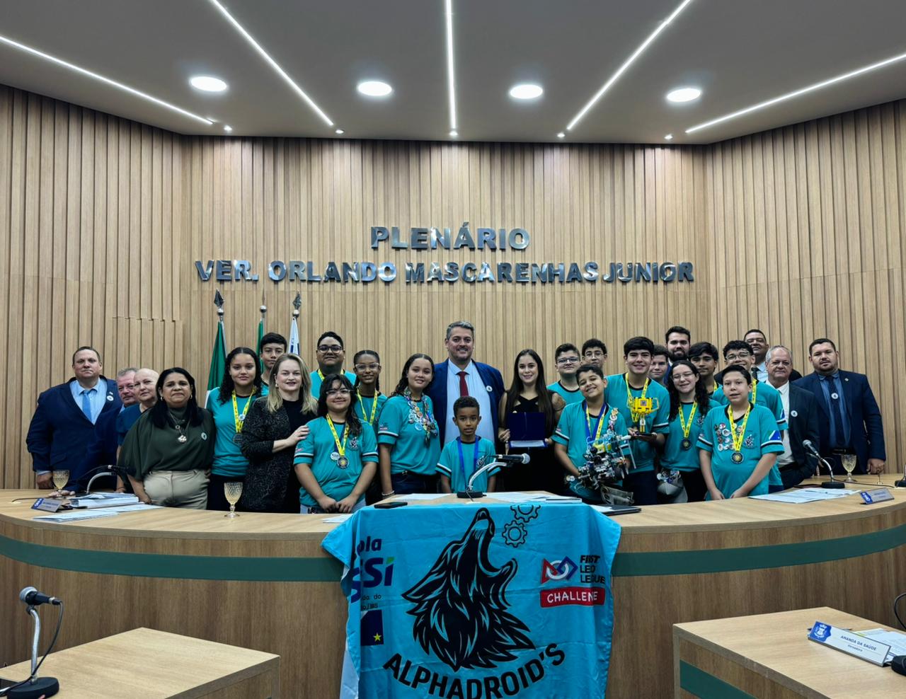 Uma das homenagens, de autoria da vereadora Amanda da Saúde, foi destinada à equipe oficial de robótica Alphadroid’s, da Escola SESI do município, em reconhecimento ao trabalho e aos resultados alcançados durante o I Festival Regional de Robótica, realizado nos dias 27 e 28 de novembro em Campo Grande.